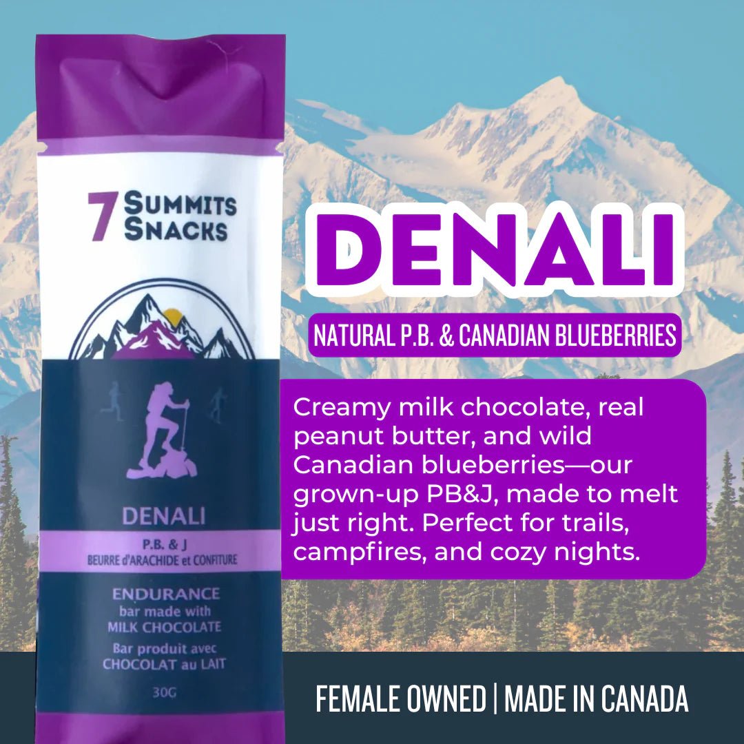 Produced with an ethically sourced rich 40% cocoa milk chocolate, we’ve added honey and natural peanut butter to craft that multi-format use. We pay homage to the mightiest mountain in North America by featuring that hiking staple, peanut butter and superfood Canadian wild blueberries for the jam pieces.