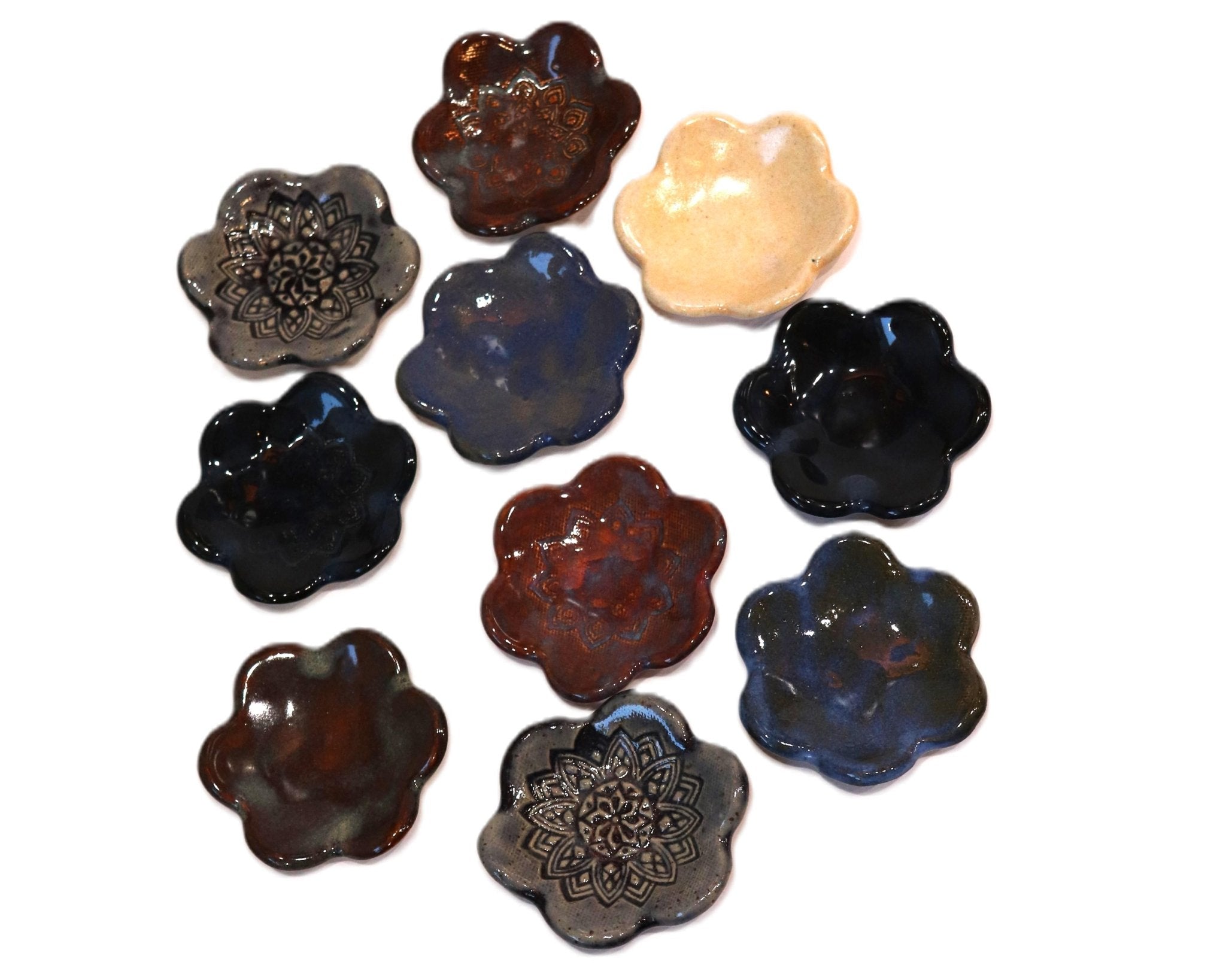 Measuring approximately 3 inches across, each little dish is handcrafted in Leduc County, Alberta. The organic flower shape and earthy finish make every piece unique.
